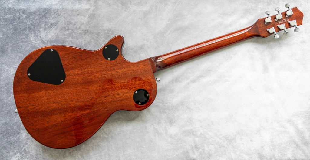 The guitar has a Les Paul-like shape, although they’re not identical. While I’m not usually a fan of pickguards and understand why some players remove them from their Les Pauls, I quite like the gray plexiglass pickguard on this Gretsch, which is rounder than a Les Paul’s. Despite its solid appearance, the guitar’s body is actually chambered, making it lighter and giving it a unique sound profile. Although it lacks the contoured body of a Stratocaster and the edges can feel hard against my forearm during long sessions, it doesn’t cause real discomfort.