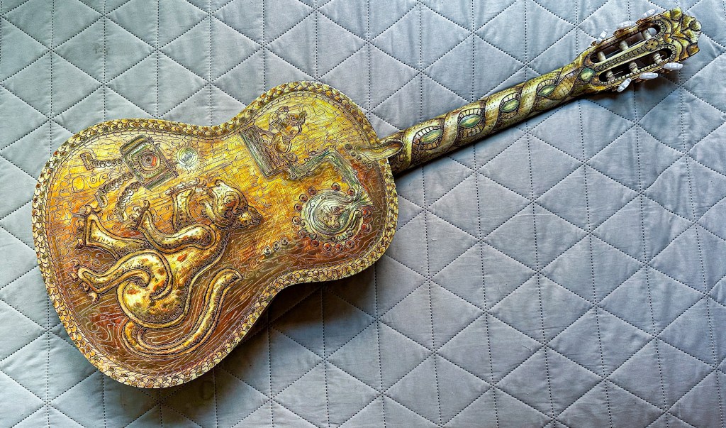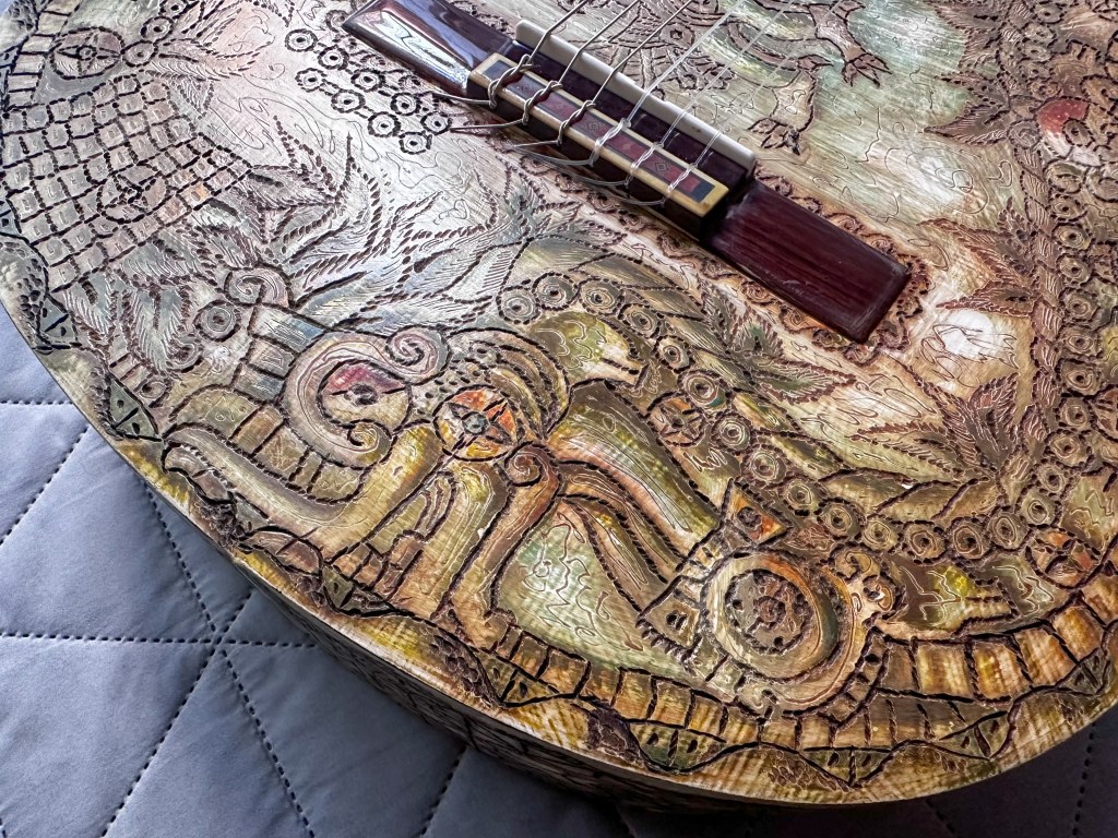 Months later, Federico reached out again, but this time with a question that piqued my curiosity. As a professor at the National School of Anthropology and History with a deep knowledge of pre-Columbian thought, Federico asked if he could do something with my guitar. Intrigued, I agreed, knowing that Federico’s understanding of Aztec symbolism and cosmogony was profound and that he was up to something.