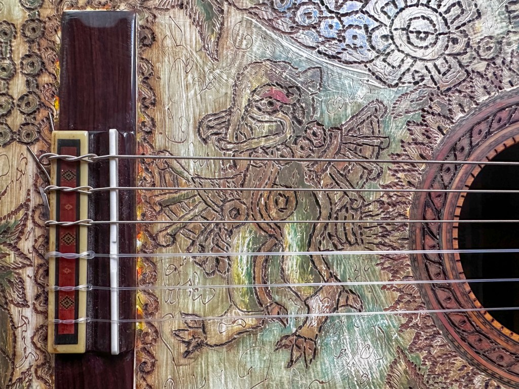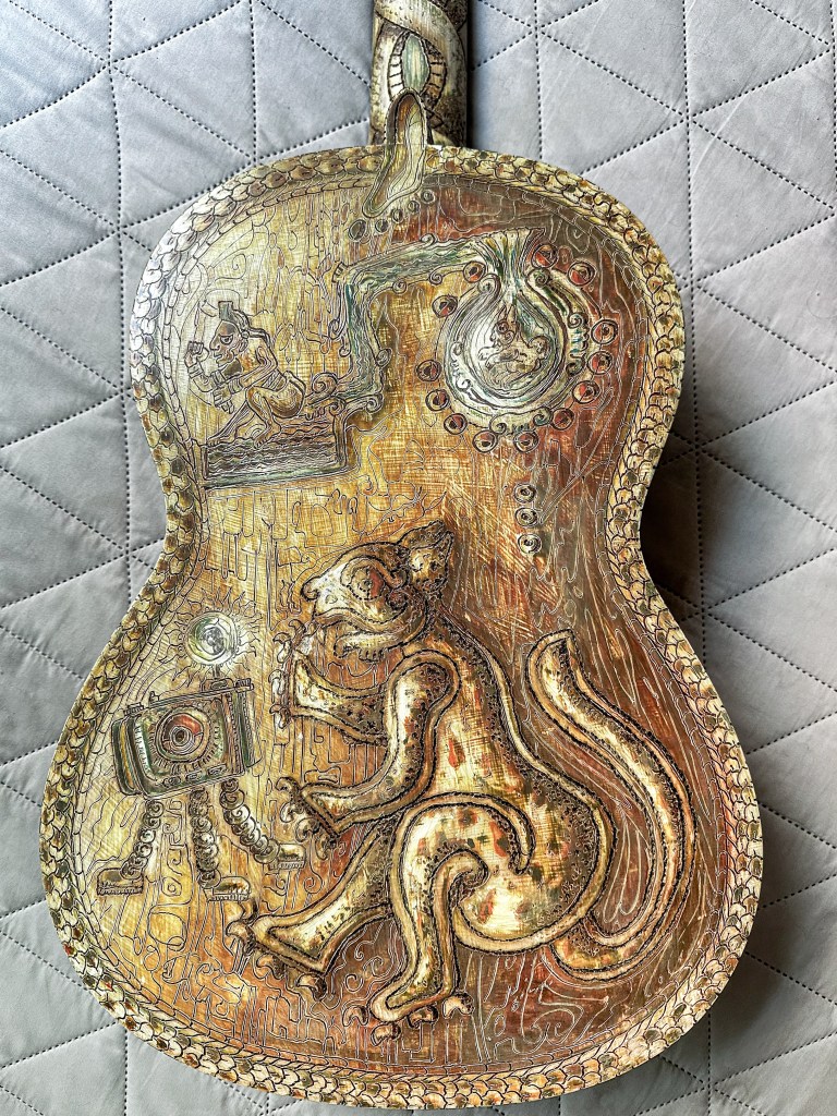 After months of work, Federico returned the guitar to me, but it was no longer just an instrument. It had been transformed into a work of art. Federico had sanded and cleaned the guitar, and though no photographic record exists of the process, the result was breathtaking. He had drawn a codex on the bare wood, one that symbolized my life—a representation deeply rooted in our shared experiences and Federico’s understanding of who I am: a photography professor, a musician, and a lover of symbolic art.