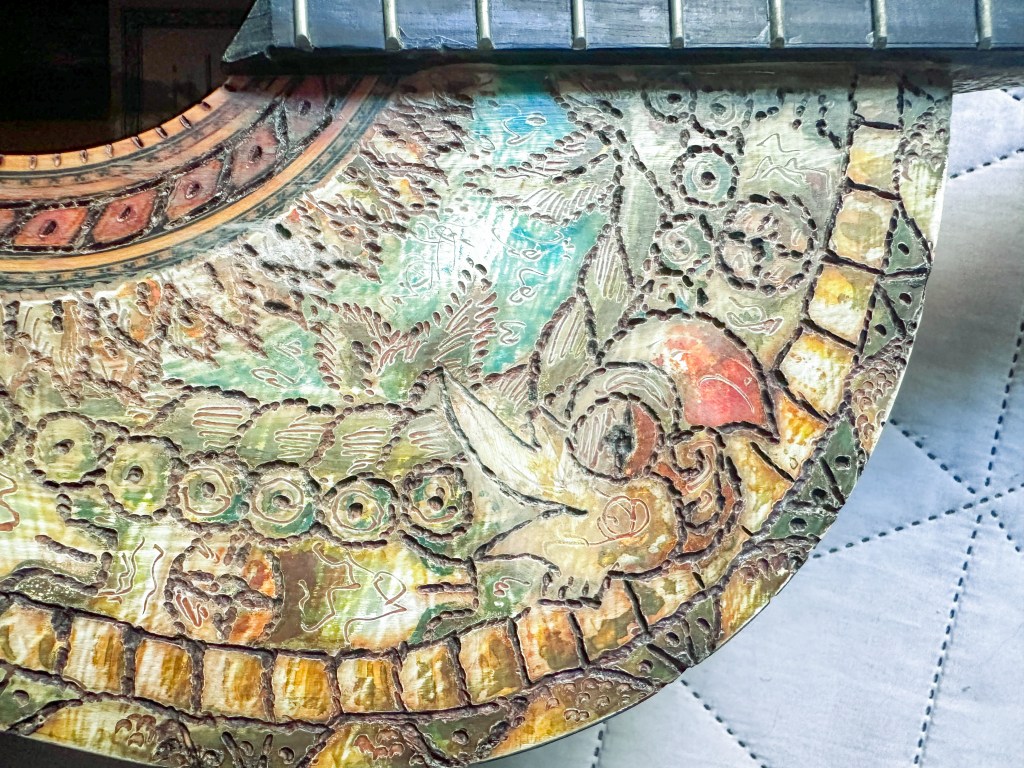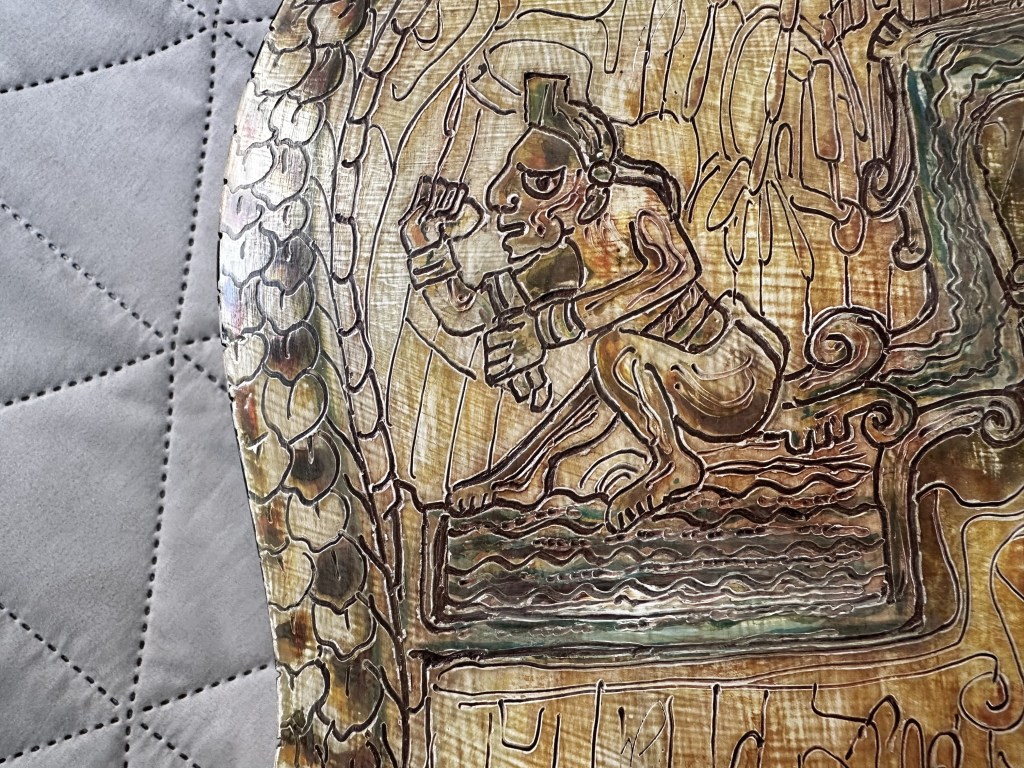 Federico’s craftsmanship didn’t stop at the drawing. He used a pyrography tool to burn the design into the wood and then painted the guitar with pigments made from formulas used by the ancient Aztecs. The colors and symbols he chose were not merely aesthetic choices; they carried profound meanings, turning the guitar into a symbolic artifact of my life.