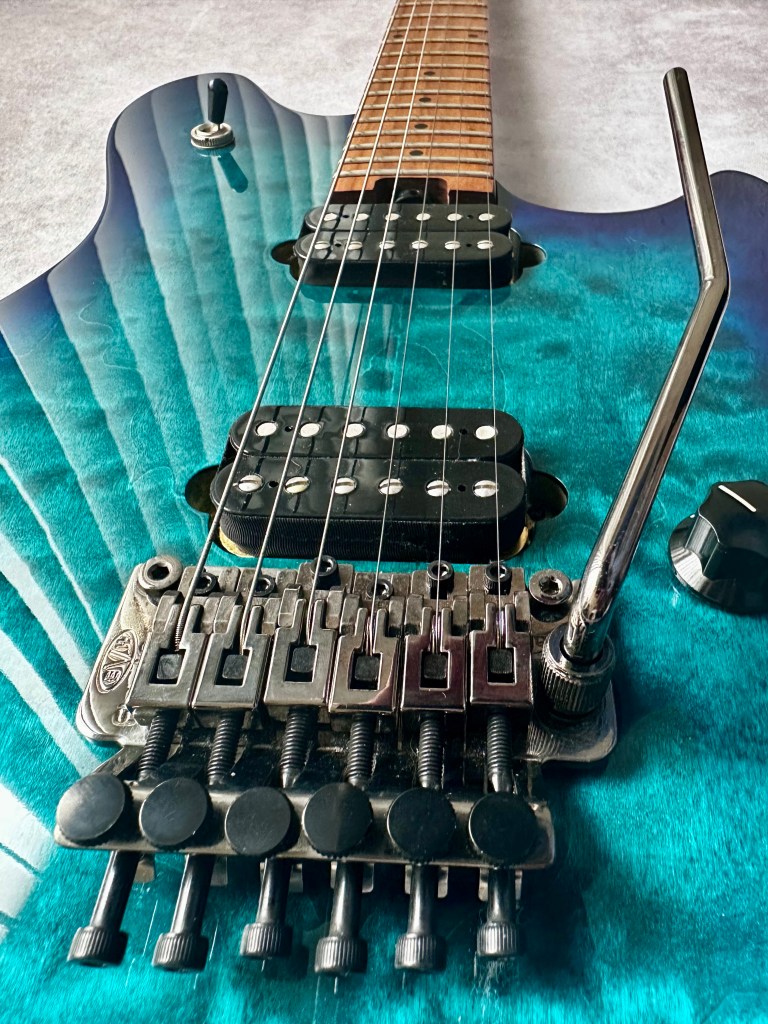 What truly sets this guitar apart is its aesthetic. My model features a quilted maple top with a Chlorine Burst finish that transitions from a vivid turquoise at the center to a darker blue at the edges. This visual spectacle is encased in a gloss urethane finish, showcasing the poplar wood’s natural beauty beneath. It’s this combination of visual and physical design that makes the Wolfgang stand out as an instrument with tons of personality, far from your generic Strat or Les Paul shape.