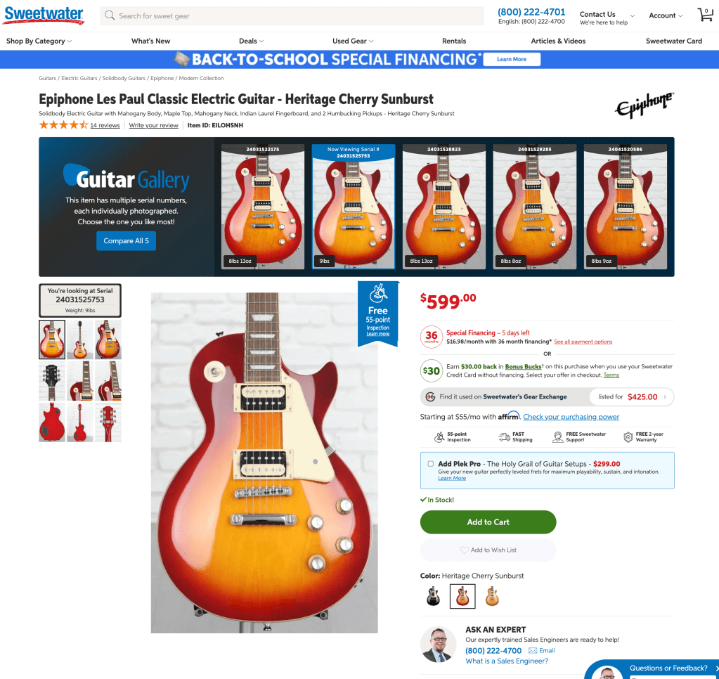 The hefty price tag of about $2600 USD put a Gibson Les Paul guitar completely beyond my budget. I then checked out the affordable line of Epiphone Les Paul, hoping for a more affordable alternative, but I was quite disappointed with the low-tier craftsmanship. The guitars I tried were of questionable quality; they didn’t leave me with a favorable impression, neither in their sound nor in their level of craftsmanship, finish, etc