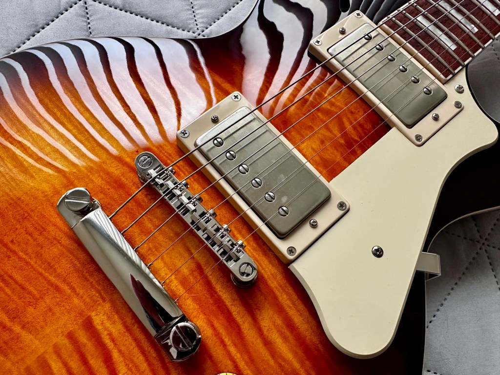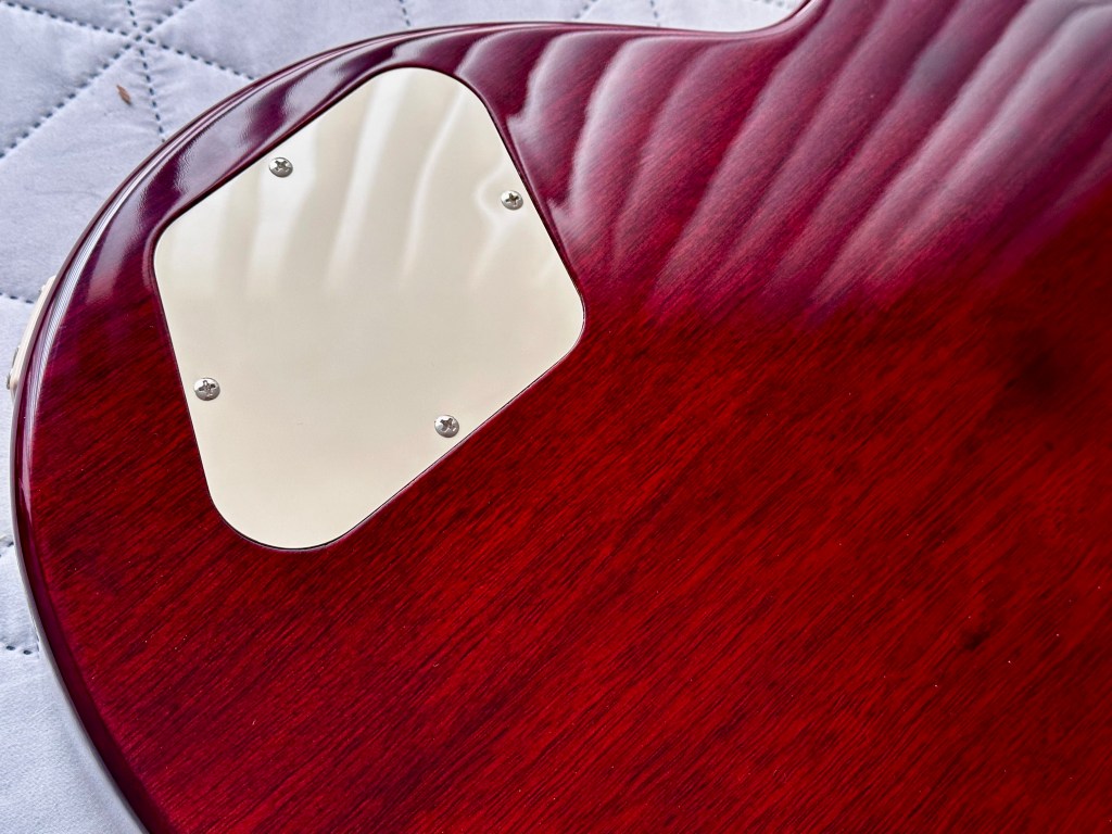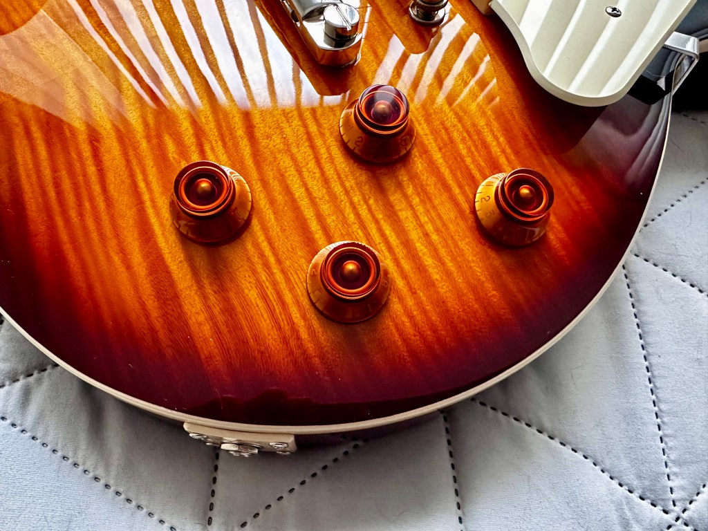 The guitar came with a somewhat inexpensive-looking pickguard that I eventually decided to remove. While it offered some comfort, I never quite warmed up to it. It also features a classic three-position selector switch in the traditional Gibson spot and Top Hat-style knobs for a timeless look.
