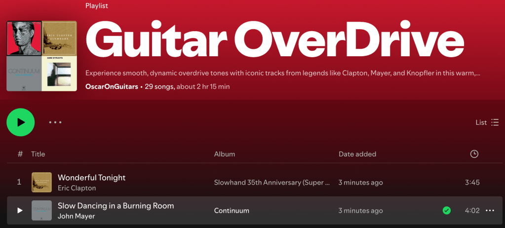 Experience smooth, dynamic overdrive tones with iconic tracks from legends like Clapton, Mayer, and Knopfler in my warm, expressive guitar-driven “Guitar OverDrive” playlist on Spotify.