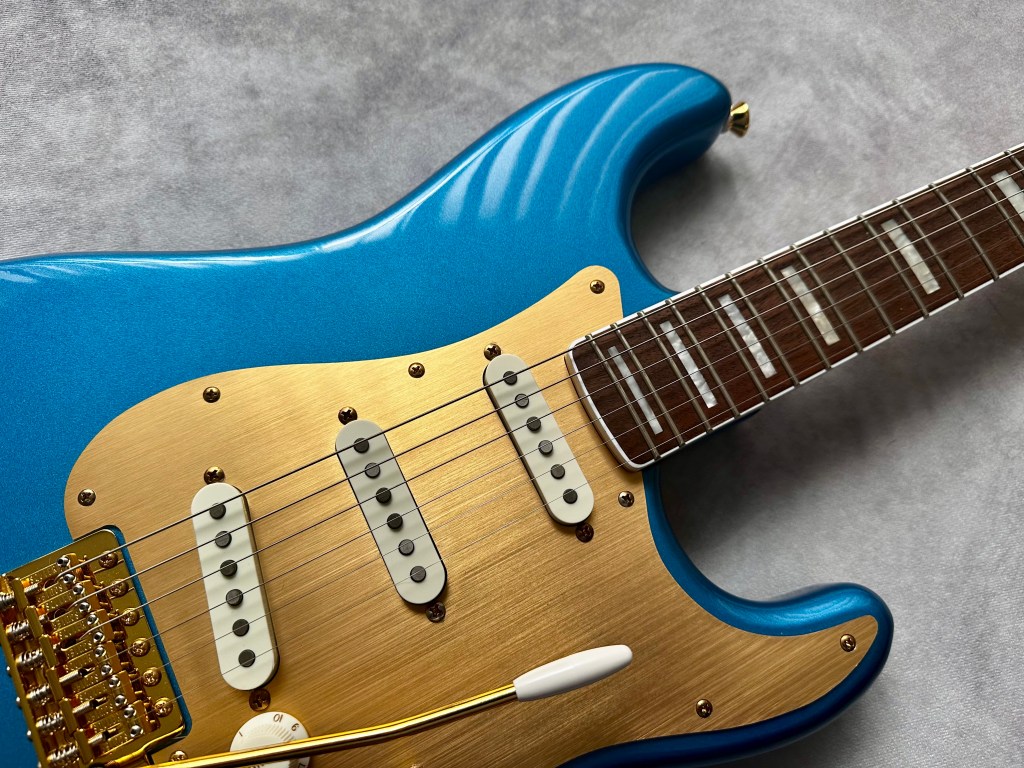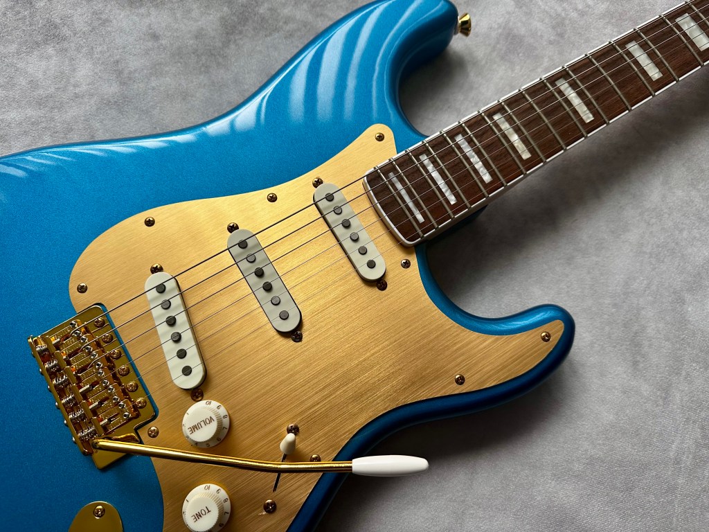 What immediately grabbed my attention was the flawless metallic paint job. Every curve and contour is impeccably done, showcasing Squier’s impressive attention to detail in this department. The Lake Placid Blue finish, combined with the gold hardware, gives the guitar a perfect blend of vintage charm and class. The anodized aluminum pickguard adds a luxurious touch, though it does feel a bit cold to the touch.