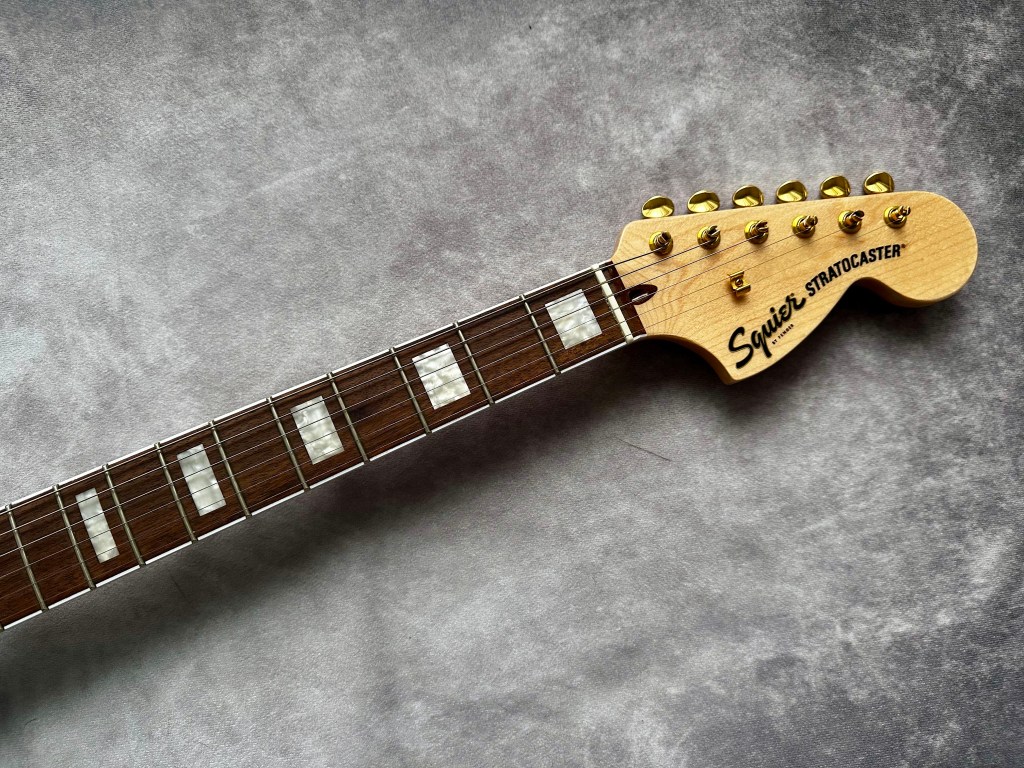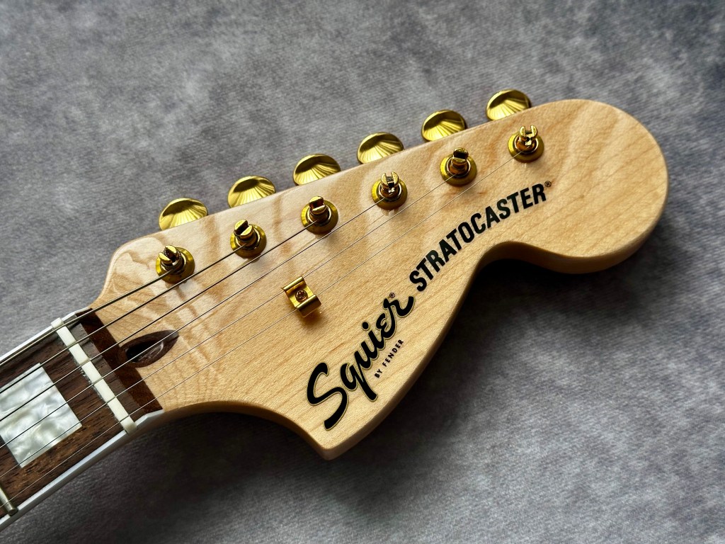 Though part of the “vintage” series, the Squier Stratocaster 40th Anniversary doesn’t attempt to look like a relic guitar. Instead, it features subtle vintage elements, like its 70s-style headstock and vintage-style tuners. The guitar has a shiny finish with just the right hint of vintage flair. I particularly like the headstock, which stands out with its bold 70s design and the golden hardware throughout the guitar. It’s a nice, elegant touch that sets it apart from your standard Stratocaster.