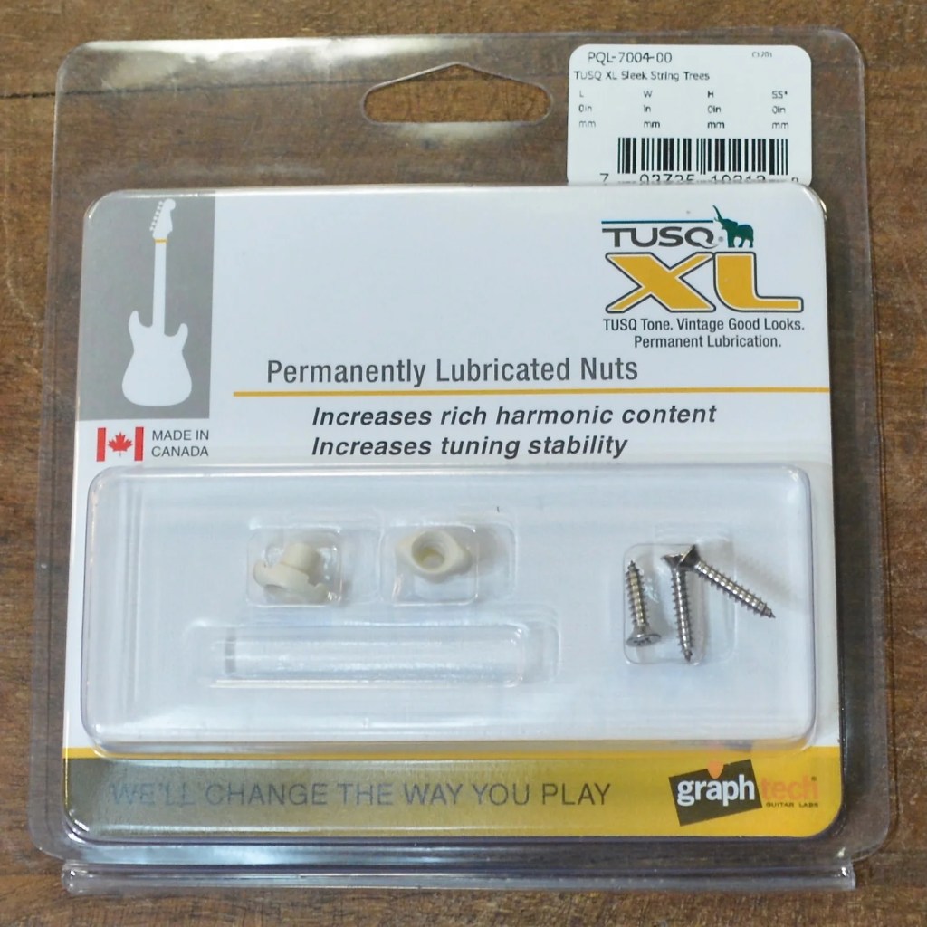 Needless to say, I ran to buy a brand new set of tuner and a tremolo. I made my research and found that the Gotoh 5105T-BS2 with 10.8 string spacing would match. For the tuners I measure everything and found that th SD91-G-T Magnum Locking tuners should do the trick. Both the tuner and the tremolo were available in golden finish. Finally, the Tusq XL String Trees should improve the tuning stability. I decided to leave the original nut since the specification states that is made of bone.