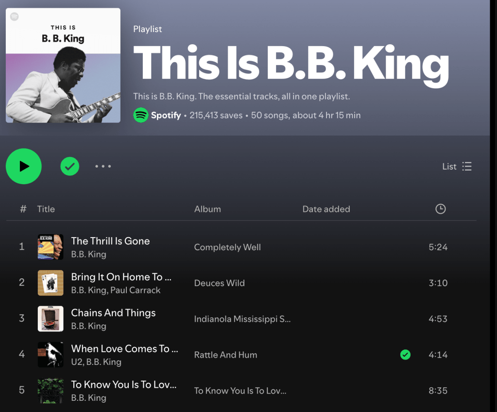 Experience the legendary tone, soulful notes, and unmatched feel of the great B.B. King in this carefully curated Spotify playlist.