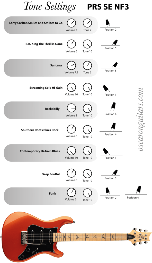 Here I made a little chart with my volume, tone, and switch position for different styles:
