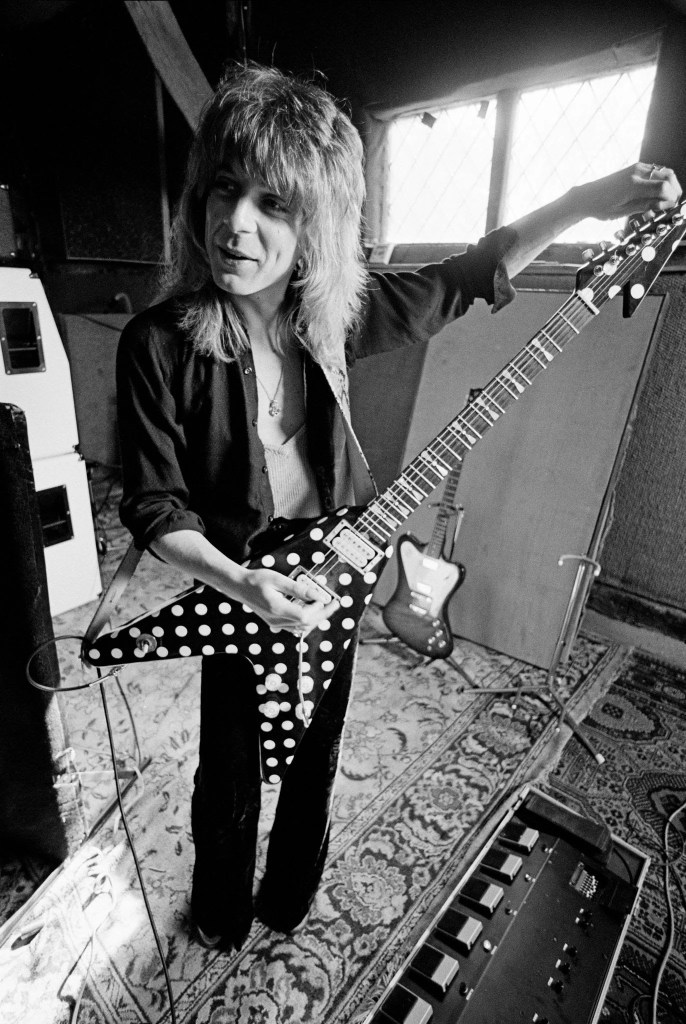 Randy Rhoads’ signature sound was a remarkable fusion of his advanced technique and a meticulously crafted gear setup. His choice of instruments played a central role in shaping his tone. Chief among them was his iconic white 1974 Gibson Les Paul Custom, known for its warm, thick tone and long sustain, which provided the foundation for many of his most memorable riffs and solos. Equally distinctive was his custom-built polka-dotted Flying V, created by luthier Karl Sandoval. This guitar featured a maple neck, a tremolo bridge, and a flashy polka-dot finish that matched Randy’s flair for showmanship while delivering a sharp, bright tone perfect for metal.