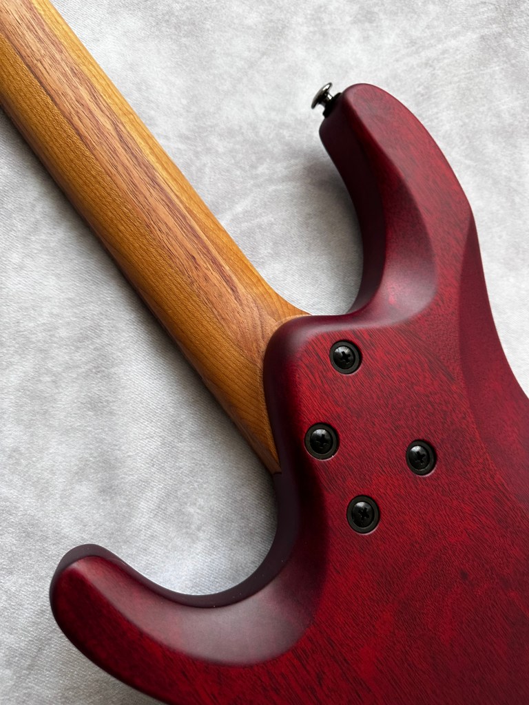 The neck on this guitar stands out in several ways. It’s not as the asymmetrical, polyhedral, trapezoid-style necks you’d find on a Strandberg. Instead, it features a more traditional Wizard “C” shape, which strikes a comfortable middle ground—neither super thin nor overly chunky. It’s made from a sturdy three-piece combination of roasted maple and bubinga. This provides it with a solid feel. It also gives a visually appealing, high-end aesthetic. The satin finish is a thoughtful touch. It makes the neck fast and smooth to play. This is true whether you’re shredding or gliding through complex chord shapes.