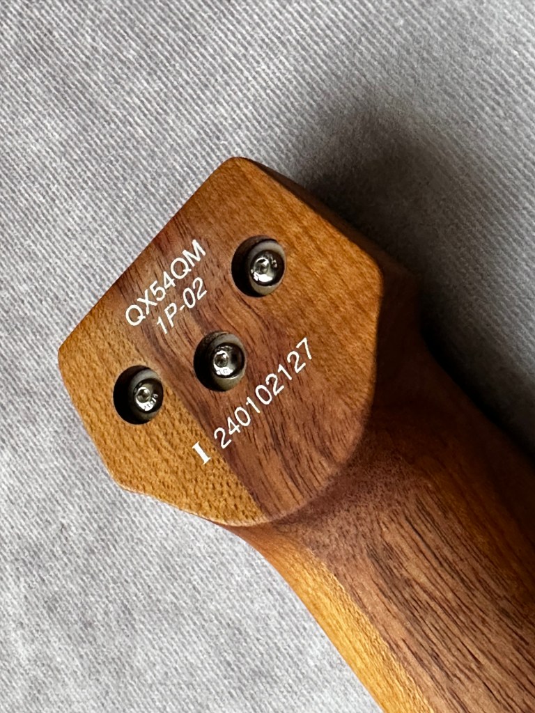 The QX54QM features a satin polyurethane finish that gives it a somewhat understated, muted appearance. It doesn’t immediately scream “spectacular instrument,” but there’s a certain elegance in its subtlety. The Blue Sphere Burst color is flawless in its execution, though whether or not it’s visually appealing comes down to personal taste. I wouldn’t call it particularly striking, but aesthetics are always subjective. What I do appreciate is the quilted maple top, which adds some visual depth, and the back of the body, finished in a transparent dark red that nicely showcases the wood grain.
