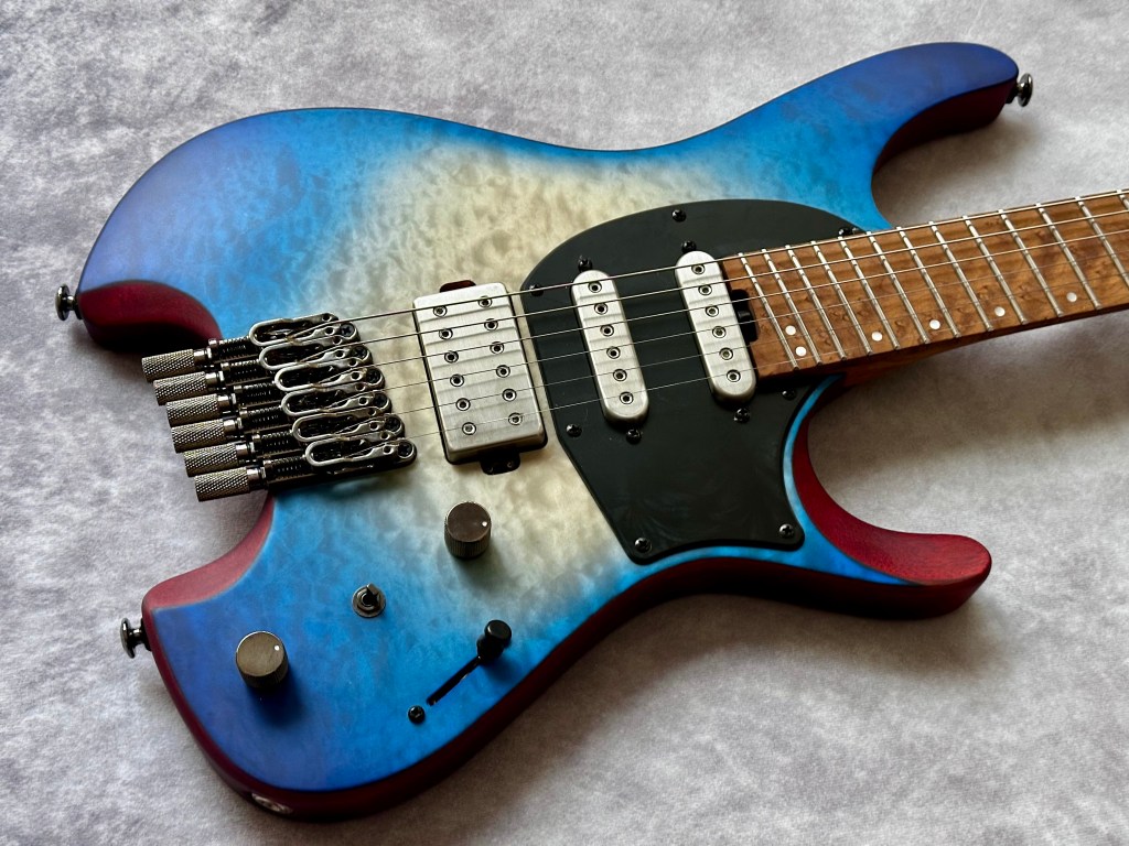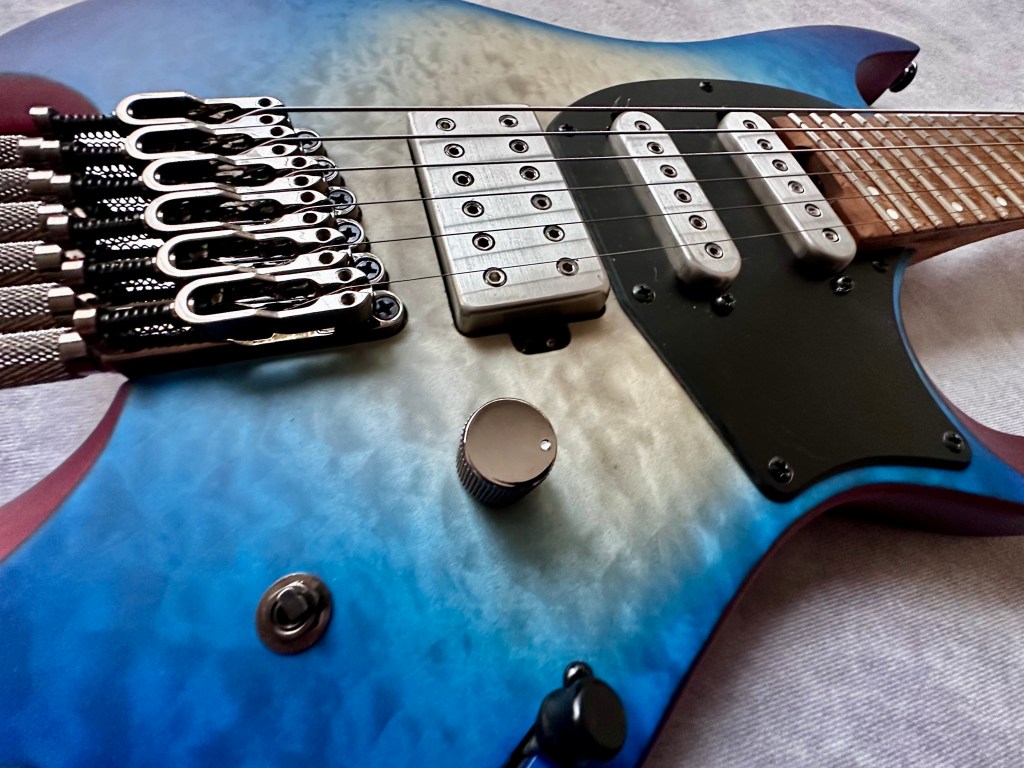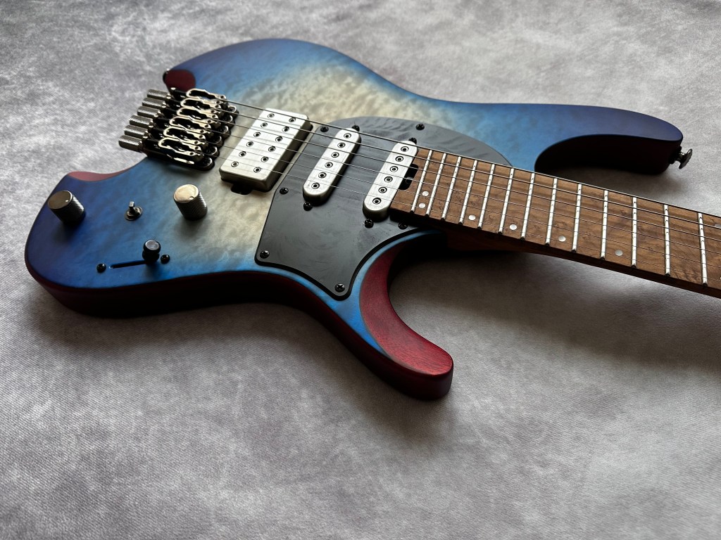 Initially, I considered the Q52 solid blue model—also with a satin finish—which is a more affordable option featuring an HH pickup configuration. However, I ultimately went for this higher-end model because I wanted the HSS configuration with single coils. There’s also a black model, but it lacks the defining feature of the 8º angled frets, making it less appealing to me. The QX52 offers the angled frets but comes with an HH configuration instead. So, if you’re specifically after the HSS layout with multiscale frets, this is your only option, whether or not you love the Maple Burst aesthetic.