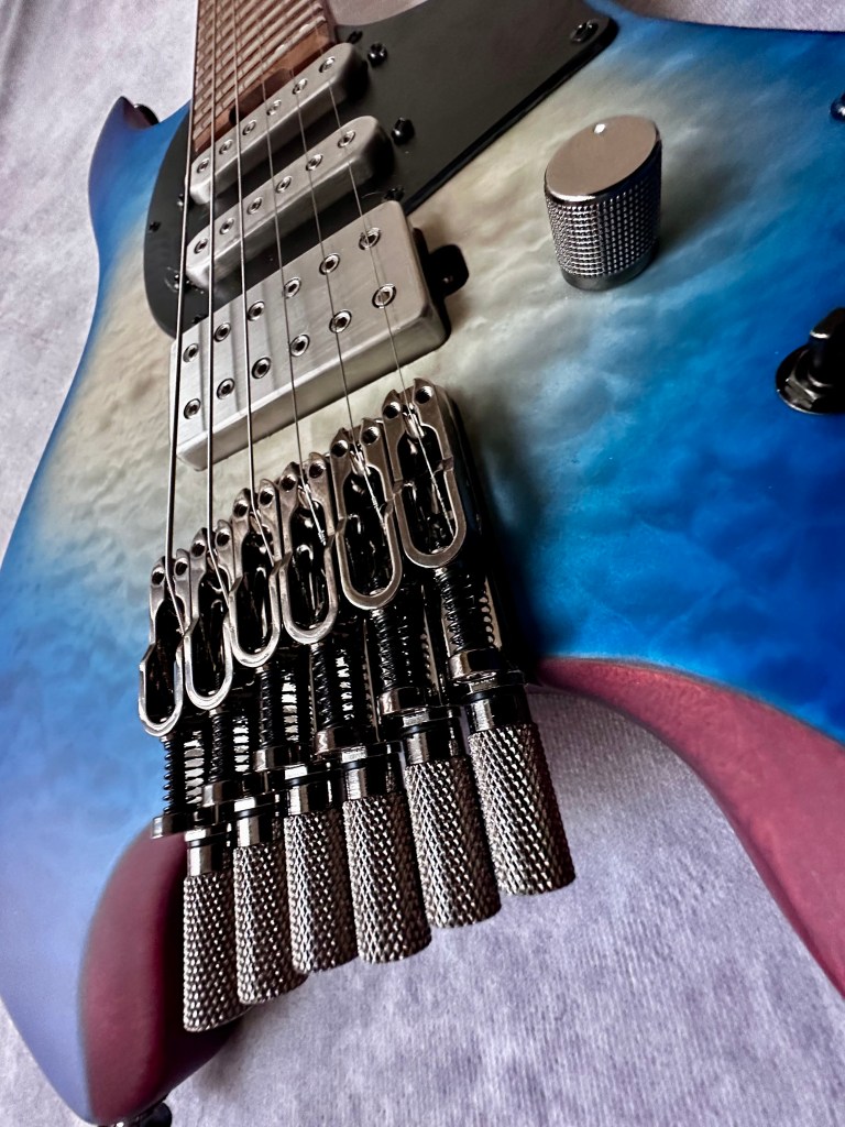 The design of the bridge itself is fascinating—it’s an ingenious piece of engineering that feels well-conceived, sturdy, and precise. While it might not reach the same level of engineering excellence as Strandberg’s system, it’s not trying to imitate it either. Instead, Ibanez has crafted a solution tailored specifically for their headless line, and in that sense, it deserves credit for originality and functionality. It looks, feels, and operates like a well-built machine. The locking mechanism at the top of the neck feels really very good—tight and precise.
