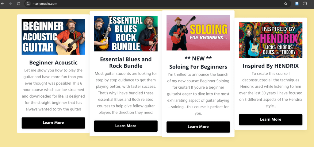 Pros: You’ll get the classic Marty Schwartz vibe you love from YouTube, but with even more content worth exploring. Cons: The lessons aren’t as structured as some other platforms, so it may require a bit more self-guided organization.