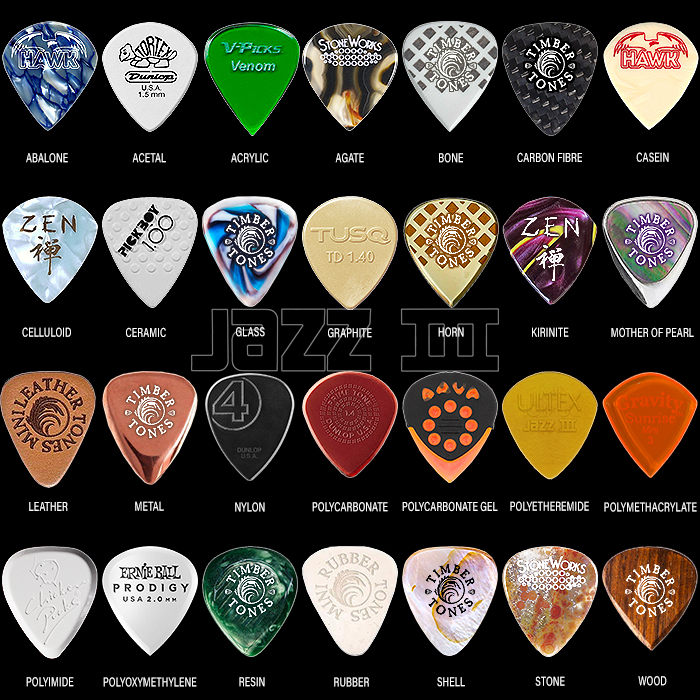 The material of your pick greatly influences how it feels and sounds. Some common materials include: