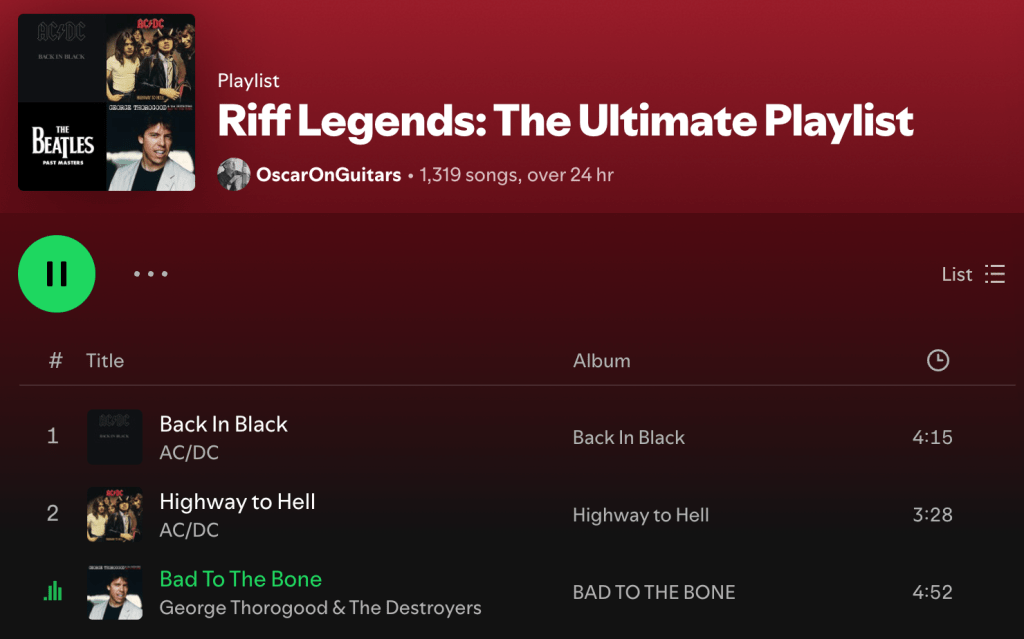 Looking for inspiration? Dive into my ultimate guitar riff playlist with over 1,300 (yes, 1,300) tracks. Learn them, then play them backwards—add your own style, nuances, and variations. Own them, and before you know it, your next iconic riff will be just around the corner.